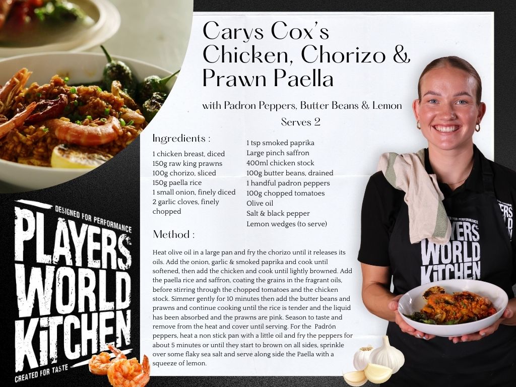 Inspired by family holidays and bold Mediterranean flavours, Carys’s chicken, chorizo & prawn paella is a comforting, flavour-packed dish made for refuelling and sharing. Available at Asda as part of the Players World Kitchen range.