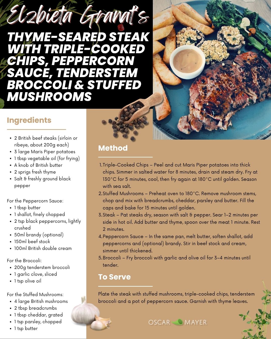 ✨ Elzbieta Granat – Thyme-Seared Steak with Triple-Cooked Chips, Peppercorn Sauce, Tenderstem Broccoli & Stuffed Mushrooms